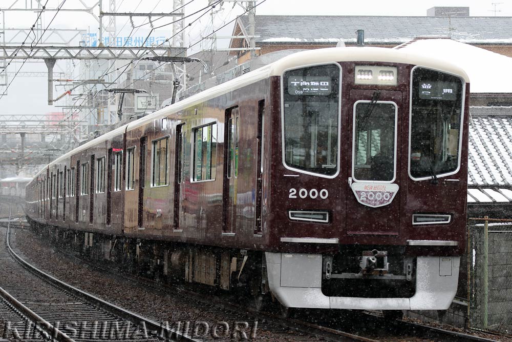 | ▲阪急電鉄 2000F(2000系) 宝塚線 2026.2.8 最後は、序に撮ったデビューから早や1年が経とうとしているデビュー記念ヘッドマークを掲げた新2000系。 雪が舞う中、こちらもそのヘッドマークに薄っすらと着雪しているものの何とか認識できる姿で記録できました。 |