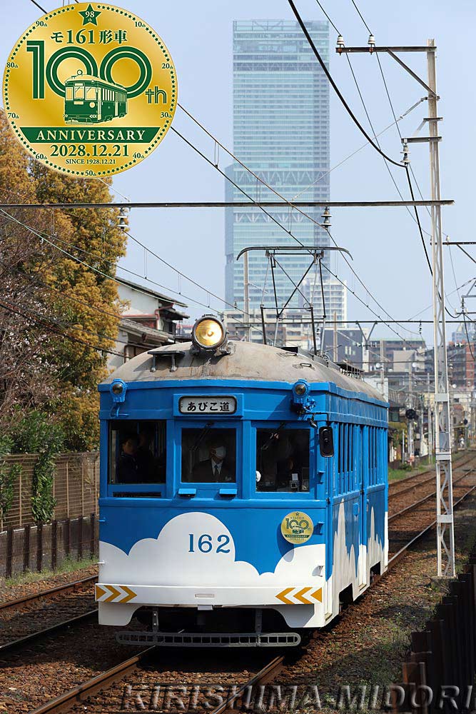 | ▲阪堺電気軌道 モ162 上町線 2026.3.29 国内現役最古である昭和3年製のモ161形の2両が、この日、特別に運行されました。 こちらは通常運行されたモ162号。 次回はGW期間中の5月3日(日)〜6日(水)にも運行される予定です。 併せて、同車両が2028年12月21日に就役100周年を迎えることを記念して、 ちょうど1,000日前となる3月27日(金)から、98周年、99周年、100周年と 3年に亘ってそれぞれ異なるデザインのマークを掲出して運行されています。 |